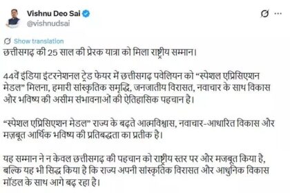 छत्तीसगढ़ की 25 साल की प्रेरक यात्रा को मिला राष्ट्रीय सम्मान, IITF में पवेलियन को ‘स्पेशल एप्रिसिएशन मेडल’