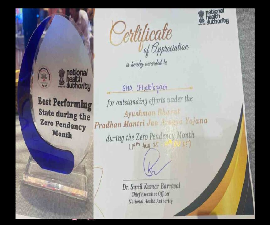 रायपुर: मुख्यमंत्री विष्णु देव साय के नेतृत्व में छत्तीसगढ़ में आयुष्मान भारत प्रधानमंत्री जन आरोग्य योजना के क्रियान्वयन उत्कृष्ट कार्य हुआ है। पिछले जनवरी 2025 तक छत्तीसगढ़ इस योजना के क्रियान्वयन में देश में सबसे पिछले पायदान पर था, लेकिन मुख्यमंत्री साय की सतत मॉनीटरिंग के बाद पिछले नौ माह में छत्तीसगढ़ आयुष्मान भारत प्रधानमंत्री जन आरोग्य योजना के क्रियान्वयन में देश में पहले पायदान पर आ गया है। भोपाल में आयोजित राष्ट्रीय स्वास्थ्य प्राधिकरण कॉन्क्लेव में छत्तीसगढ़ को श्रेष्ठ प्रदर्शन राज्य का सम्मान प्रदान किया गया।
