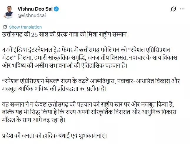 रायपुर : सीएम साय ने बड़ी जानकारी X के जरिए साझा किया है, उन्होंने बताया कि छत्तीसगढ़ की 25 साल की प्रेरक यात्रा को मिला राष्ट्रीय सम्मान। 44वें इंडिया इंटरनेशनल ट्रेड फेयर में छत्तीसगढ़ पवेलियन को “स्पेशल एप्रिसिएशन मेडल” मिलना, हमारी सांस्कृतिक समृद्धि, जनजातीय विरासत, नवाचार के साथ विकास और भविष्य की असीम संभावनाओं की ऐतिहासिक पहचान है।