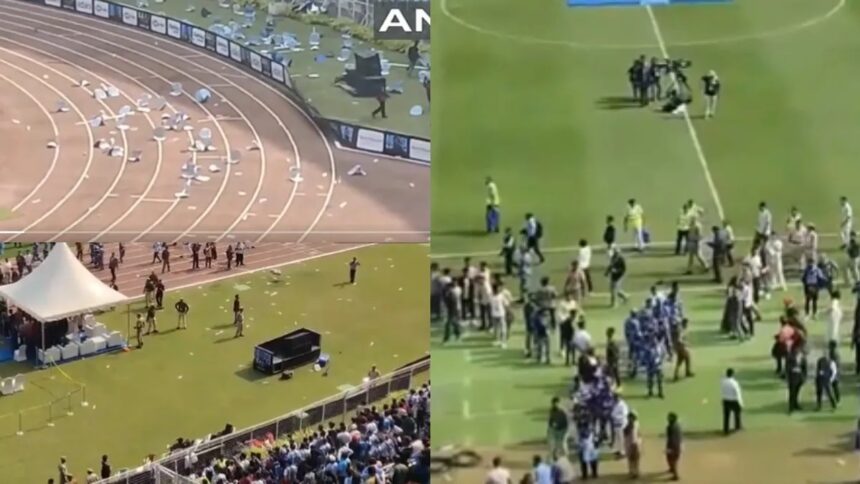 #WATCH | Kolkata, West Bengal: Angry fans threw bottles and chairs from the stands at Kolkata's Salt Lake Stadium