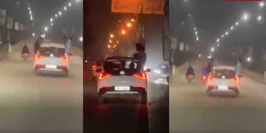 वायरल हो रहे वीडियो में देखा जा सकता है कि कार की खिड़कियों से युवक बाहर झूलते हुए सड़क पर जानलेवा करतब कर रहे हैं। कार की स्पीड स्पीड लिमिट से काफी ज्यादा थी जिससे सड़क पर चल रहे अन्य वाहन चालकों और राहगीरों की जान पर बन आई। बताया जा रहा है कि हुड़दंग मचाने वाले पांच युवक कार में सवार थे और यह घटना शनिवार रात करीब 2 बजे की है।